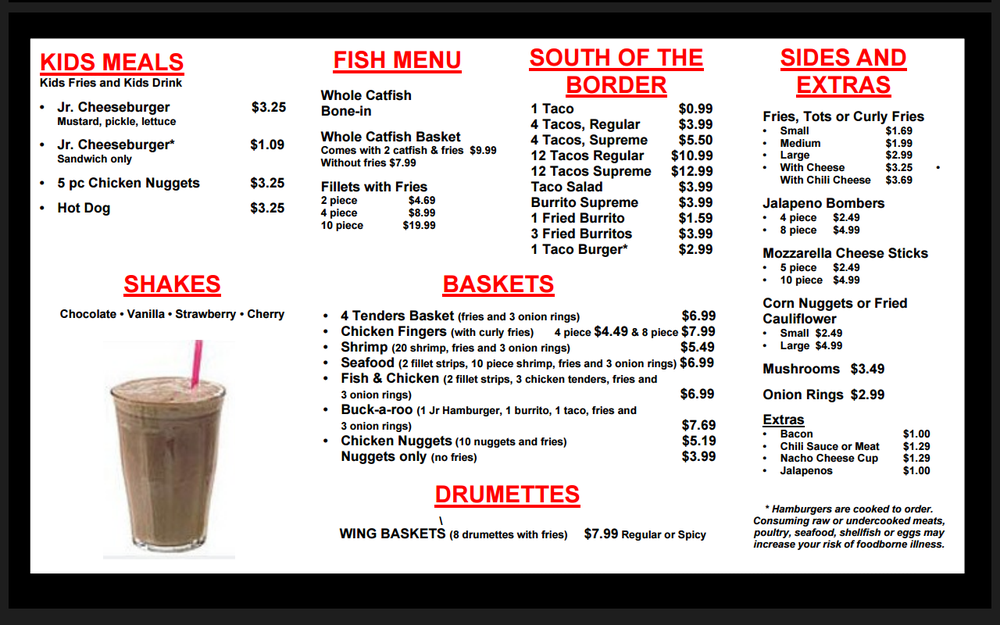 Indulge in their diverse menu, featuring enticing Baskets like the Seafood Basket with boneless fish fillet and shrimp, or try a mouthwatering Combo Meal such as the savory Chili Dog Combo.