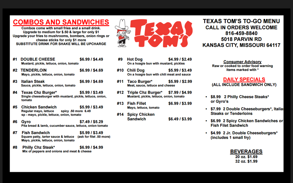 Don't miss the renowned Sandwiches, including the flavorful Chicken Philly and the classic Texas Cheeseburger. With raving reviews about their freshly prepared meals and crispy fried delights, Texas Toms is where food cravings turn into culinary bliss!